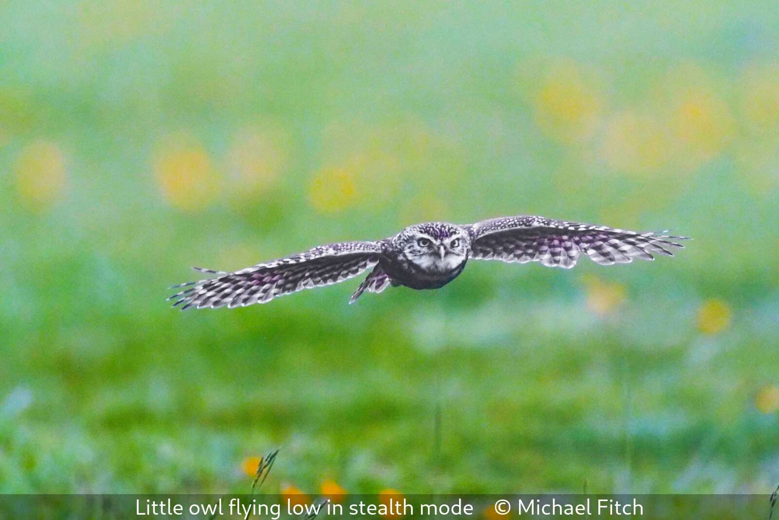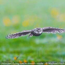 little owl flying low in stealth mode